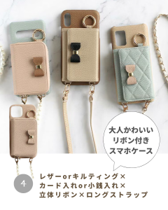 ④【レザーorキルティング×カード入れor小銭入れ×立体リボン×ロングストラップ】