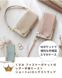 ③【くすみ ファスナーポケット付 レザー手帳ケース×ショートorロングストラップ】