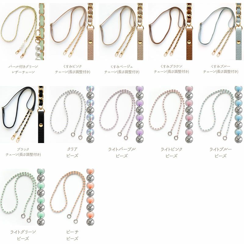 大人かわいいくすみカラーのレザーストラップや、オシャレのワンポイントにもなるパールやチェーンのストラップ等、全33色からお好きなストラップがお選び頂けます。