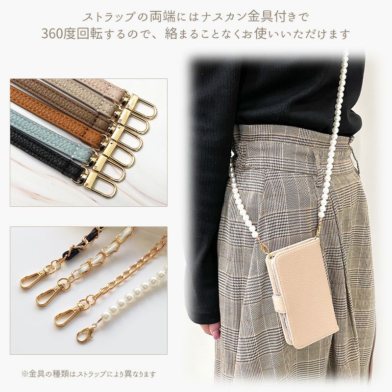 スマホケース 手帳 Android スマホ ケース カバー スマホカバー 携帯 Android アンドロイド カード ベルト ストラップ穴 ネックストラップ パール チェーン レザー 革 皮 PU スマホケース 手帳型 Android【くすみレザーorキルティング手帳ケース×選べるロングストラップ】スマホショルダー ショルダー タイプ スマホカバー 韓国 縦 横 肩掛け 斜めがけ 首掛け ギフト メール便送料無料 受注生産