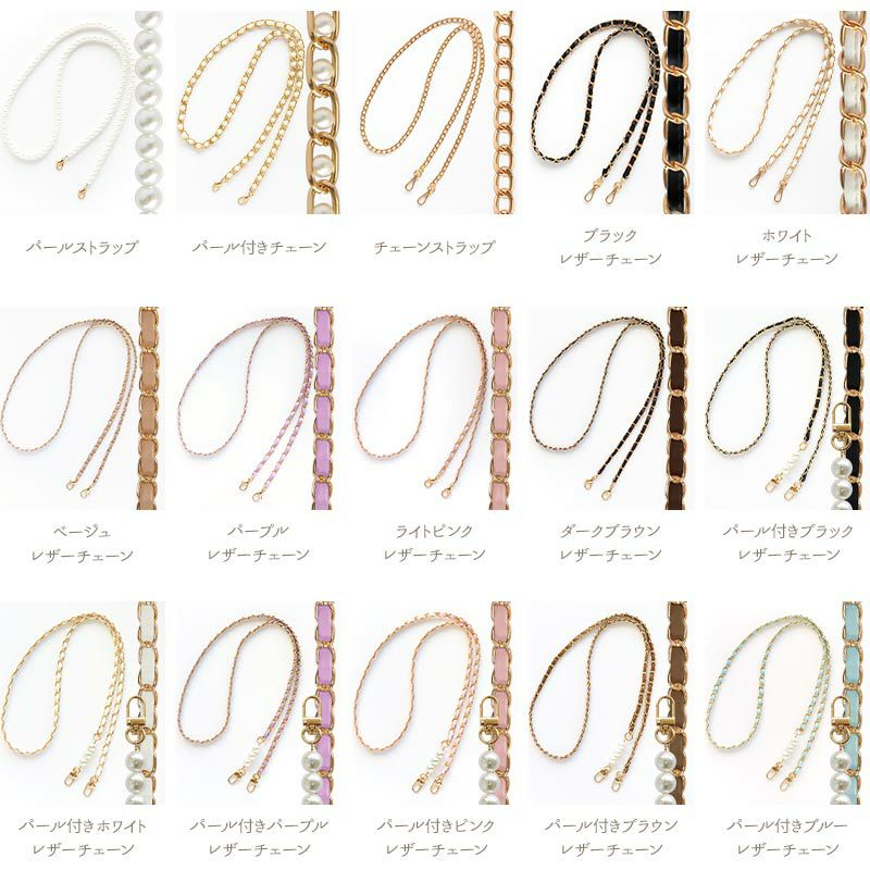 大人かわいいくすみカラーのレザーストラップや、オシャレのワンポイントにもなるパールやチェーンのストラップ等、全33色からお好きなストラップがお選び頂けます。