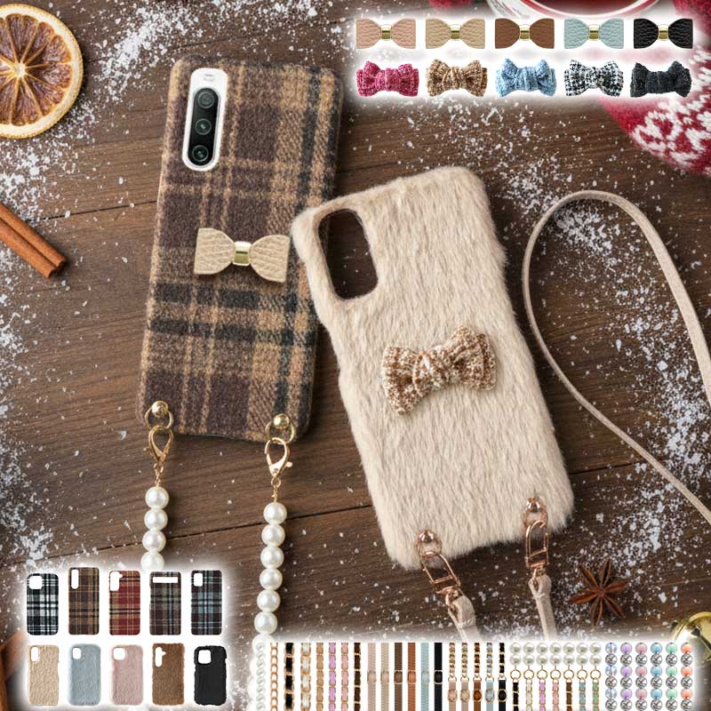 商品名:スマホケース ハード 全機種対応【ファーorチェック柄ケース×立体リボン×ショートorロングストラップ】スマホショルダー ショルダー タイプ スマホカバー iphone 肩掛け 斜めがけ 首掛け ギフト メール便送料無料 受注生産