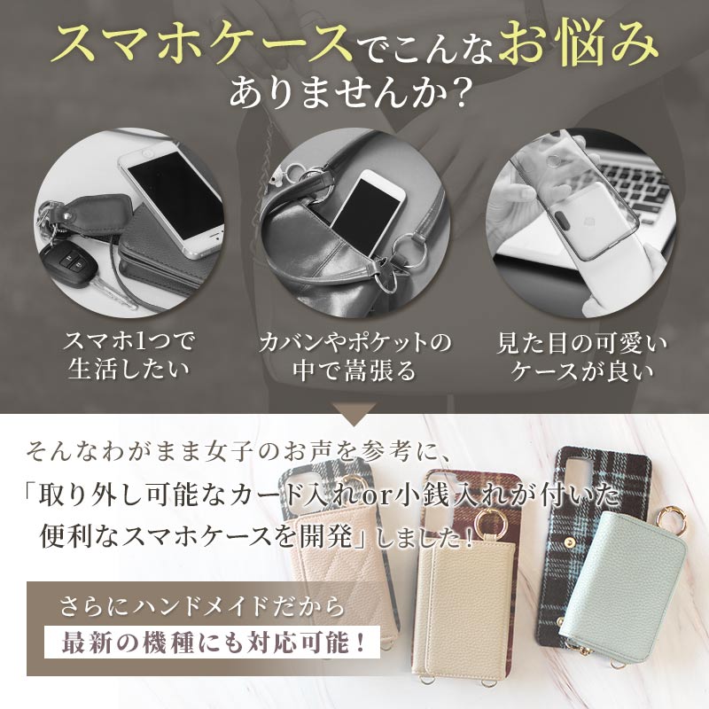 商品名:スマホケース ハード 全機種対応【ファーorチェック柄ケース×カード入れor小銭入れ×ショートorロングストラップ】スマホショルダー ショルダー タイプ iphone android 背面収納 くすみ 韓国 ギフト メール便送料無料 受注生産