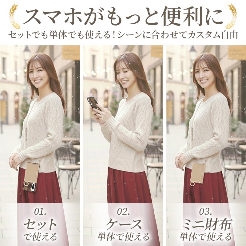 手帳型ケース、クリアケース、カード入れor小銭入れ、ロングストラップがセットになっていて、気分やコーデに合わせて自由に組み合わせられるのが魅力!スナップボタンで簡単に着脱できてとても便利です。