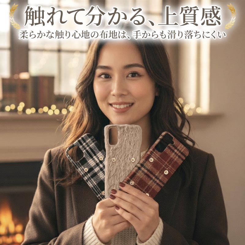 衝撃に強く薄くて軽いハードケースに、ファー素材またはチェック柄の生地を全面に貼り付ける加工を施しています。